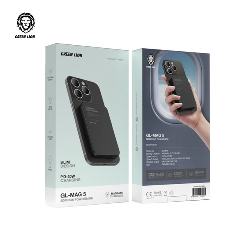 سازگار باپاوربانک گرین لاین مدل GL-MAG 5 یک شارژر همراه با طراحی مدرن و ابعاد جمع‌وجور است که با ظرفیت ۵۰۰۰ میلی‌آمپر ساعت (۱۸.۵ وات‌ساعت)، امکان شارژ مطمئن دستگاه‌های هوشمند را در طول روز فراهم می‌کند. این محصول با وزن سبک و ضخامت کم، گزینه‌ای مناسب برای حمل روزانه در کیف یا جیب به شمار می‌آید. این پاوربانک از فناوری شارژ سریع USB-C Power Delivery با توان خروجی حداکثر ۲۰ وات پشتیبانی می‌کند و می‌تواند گوشی‌های سازگار را در مدت‌زمان کوتاه شارژ کند. علاوه بر این، قابلیت شارژ بی‌سیم MagSafe با توان حداکثر ۱۵ وات، امکان شارژ گوشی بدون نیاز به کابل را فراهم می‌سازد. وجود اتصال مغناطیسی قدرتمند، موجب ثابت ماندن گوشی روی سطح پاوربانک شده و از جدا شدن ناخواسته آن جلوگیری می‌کند. چهار چراغ نشانگر LED روی بدنه، میزان شارژ باقی‌مانده پاوربانک را نمایش می‌دهند و کاربر را از وضعیت باتری مطلع می‌سازند. همچنین این محصول به سیستم‌های ایمنی مختلف از جمله محافظت در برابر اتصال کوتاه، افزایش دما و شارژ بیش‌ازحد مجهز است تا هم از سلامت دستگاه و هم از خود پاوربانک محافظت شود. با توجه به ترکیب ویژگی‌هایی مانند طراحی باریک، پشتیبانی از شارژ سریع سیمی و بی‌سیم، اتصال مغناطیسی مطمئن و سیستم‌های حفاظتی، پاوربانک Green Lion GL-MAG 5 انتخابی مناسب برای استفاده روزمره، سفر و محیط کار خواهد بود.